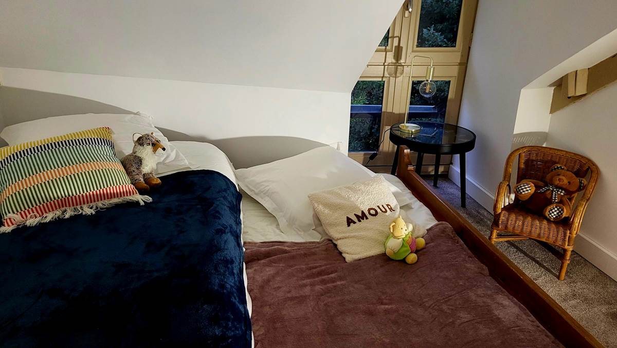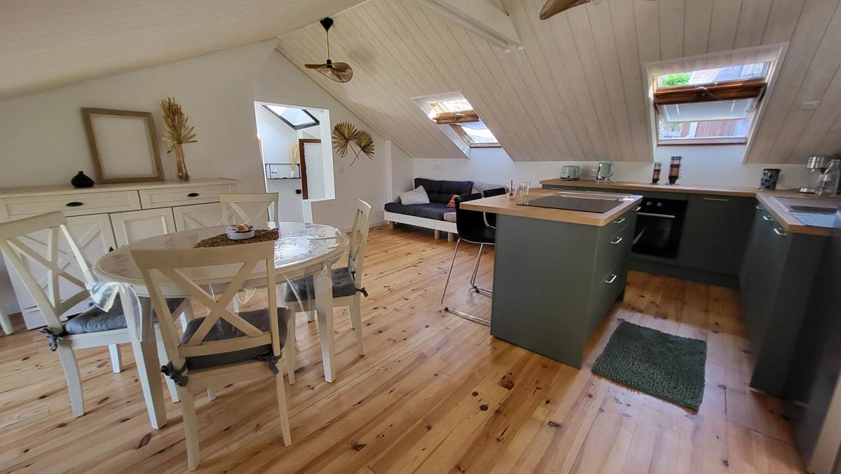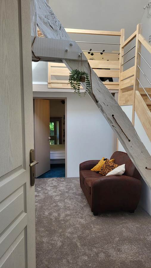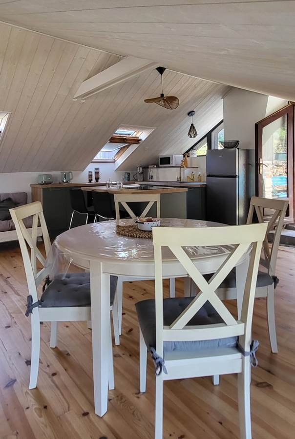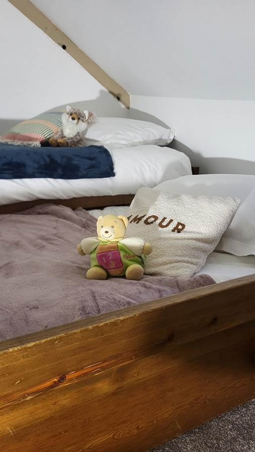 It consists of a large open-plan living room/kitchen, fully equipped, a lounge and a mezzanine games room with foosball, 3 bedrooms and a bathroom and toilet.