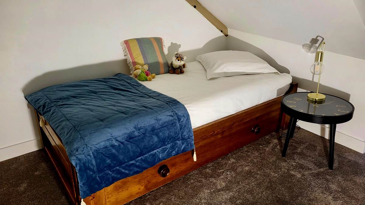 🛏️ a small room with 1 single bed and 1 pull-out bed