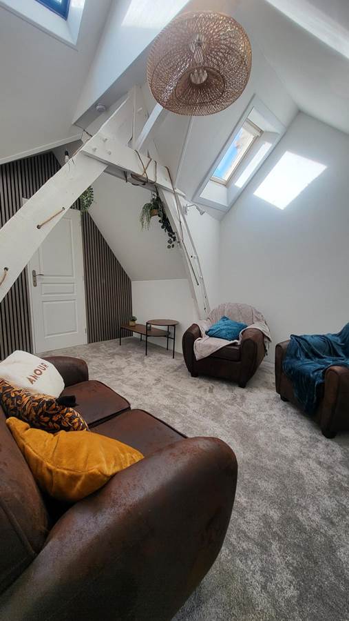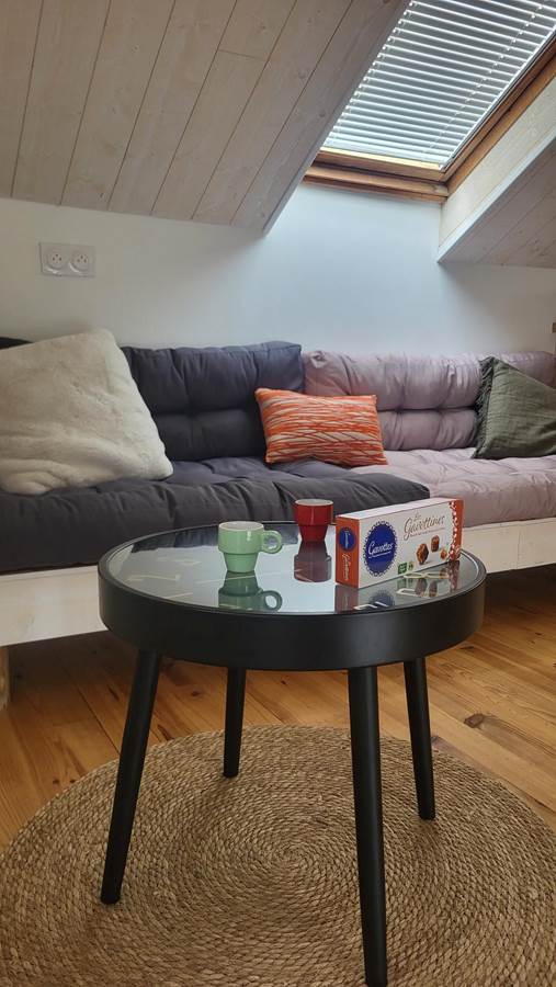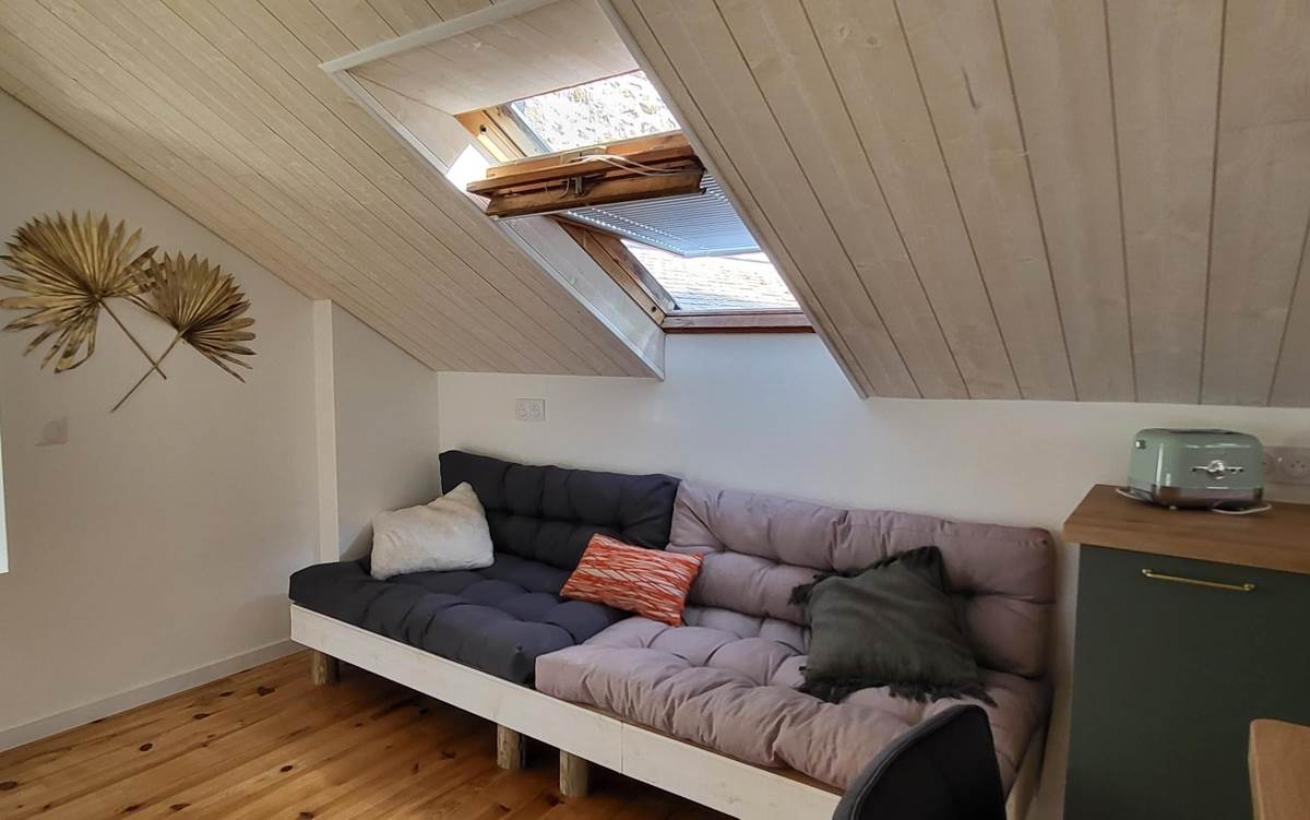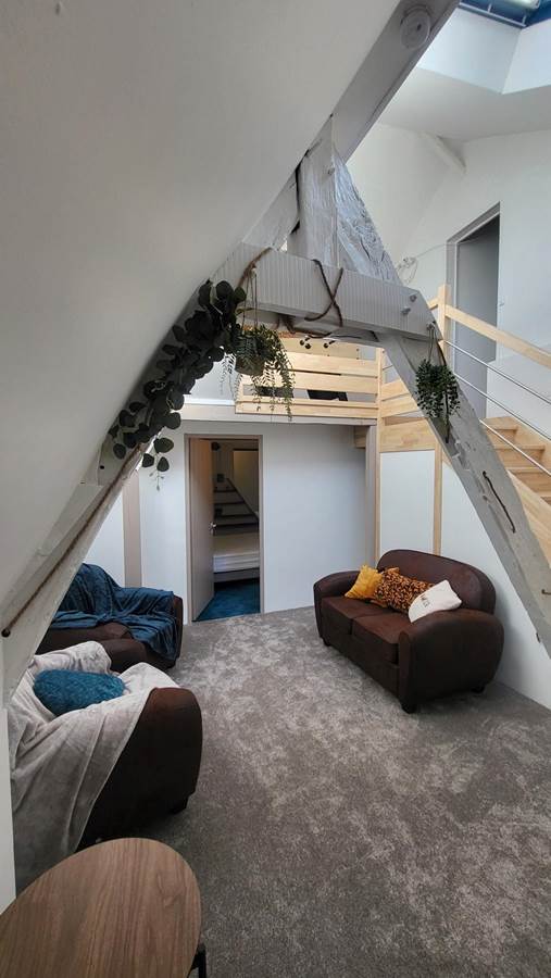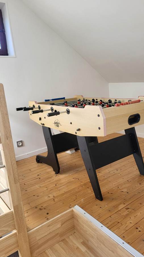 It consists of a large open-plan living room/kitchen, a lounge and a mezzanine games room with foosball, 2 bedrooms and a bathroom and toilet.