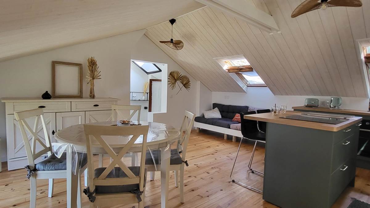 A beautiful open-plan living room and fully equipped kitchen with direct access to the garden, terrace, and garden furniture.